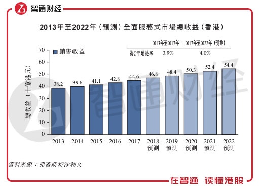 弗若斯特沙利预计,2017年至2022年香港餐饮行业将实现4.1%的复合年增长率达到1381亿元。