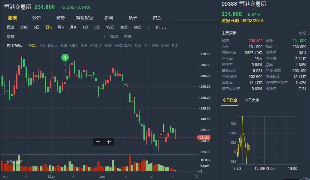 截至7月17日10:42,港交所跌0.94%,报231.6港元。