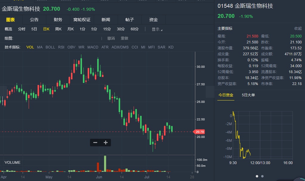 截至7月17日11:10,金斯瑞跌1.90%,报20.7港元。
