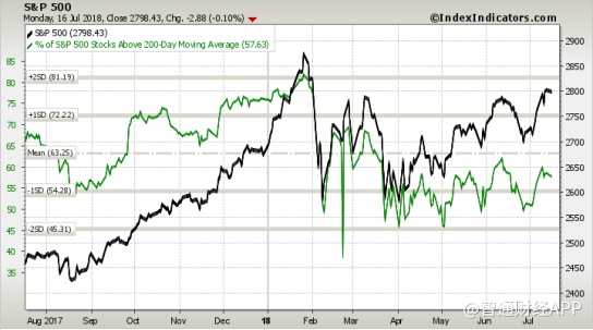 美股这次势头强劲,一枝独秀。但读者不难发现只是纳指破顶,银行股等股跌得不少。如果我们利用200日线作参考,你会发现约40%股份都在200日牛熊分界线以下,即表示S&P500指数有40%股份进入了熊市。
