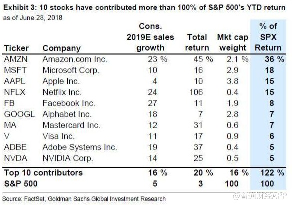 截至6月28日,标普500指数年内涨幅为3%。单是亚马逊一只同期涨幅为45%,一只股票对标普500指数涨幅的贡献率就高达36%。苹果和奈飞对标普500指数涨幅的贡献率均为15%,Facebook为8%,谷歌为7%。