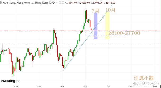 之前笔者曾说叫大家小心6月,读者可以留意在周期上,上证指数及恒生指数应该会在7月尾至8月中左右见第一个底部,上证底部目标在2600-2750左右,恒生指数可能是27700/27300/26300。