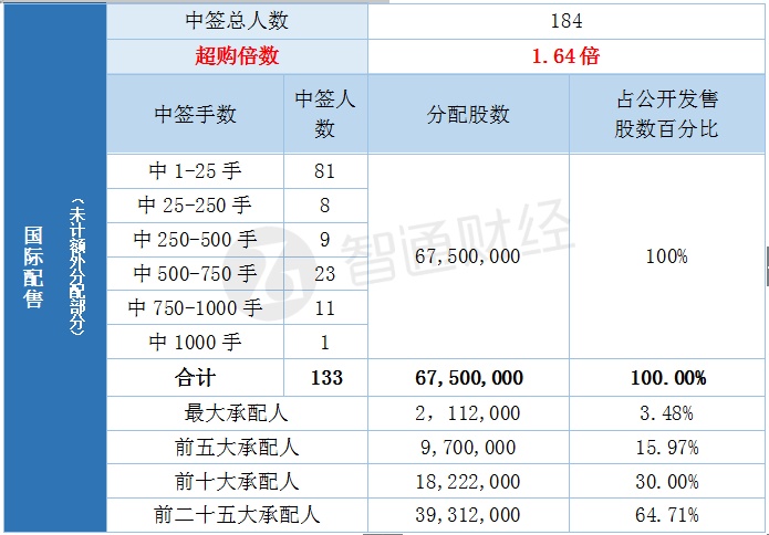 国际配售中签总人数为133人,超购倍数1.64倍。