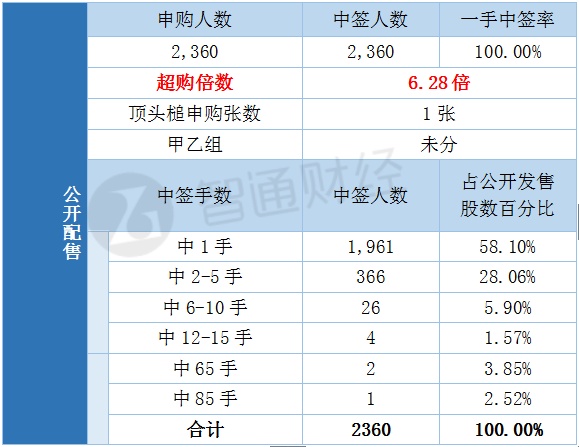 其中,公开配售H股申购人数2360人,一手中签率100%,超购倍数6.28倍。