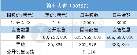智通财经APP获悉,7月17日,网络游戏开发商及营运商第七大道(00797)配售结束。本次配售招股价区间为1.5-2.22港元,最终定价1.5港元,每手3000港元。