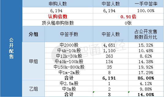 其中,公开配售申购人数6194,一手中签率100%,认购倍数0.91倍。