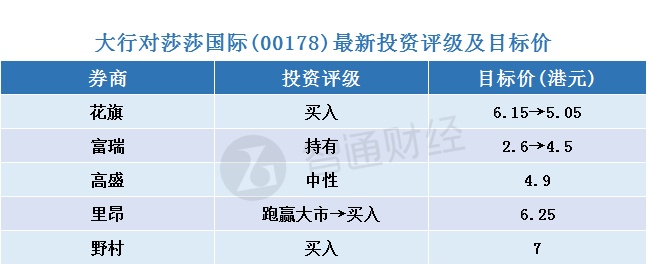 二、大行对莎莎国际(00178)最新投资评级及目标价