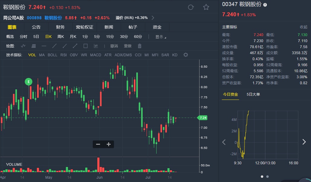 截至7月18日10:34,鞍钢股份涨1.83%,报7.24港元。