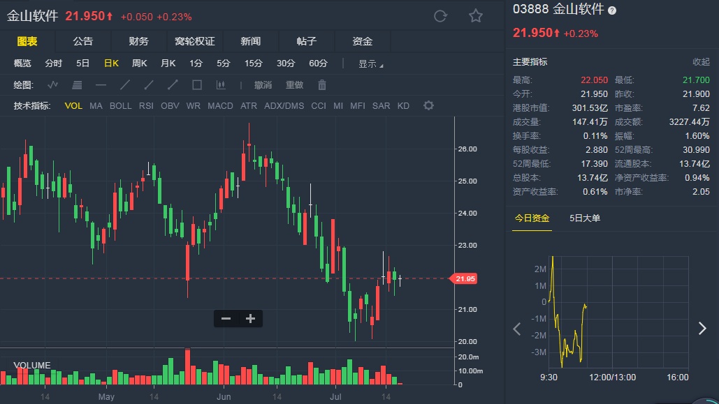 截至7月18日11:01,金山软件涨0.23%,报21.95港元。