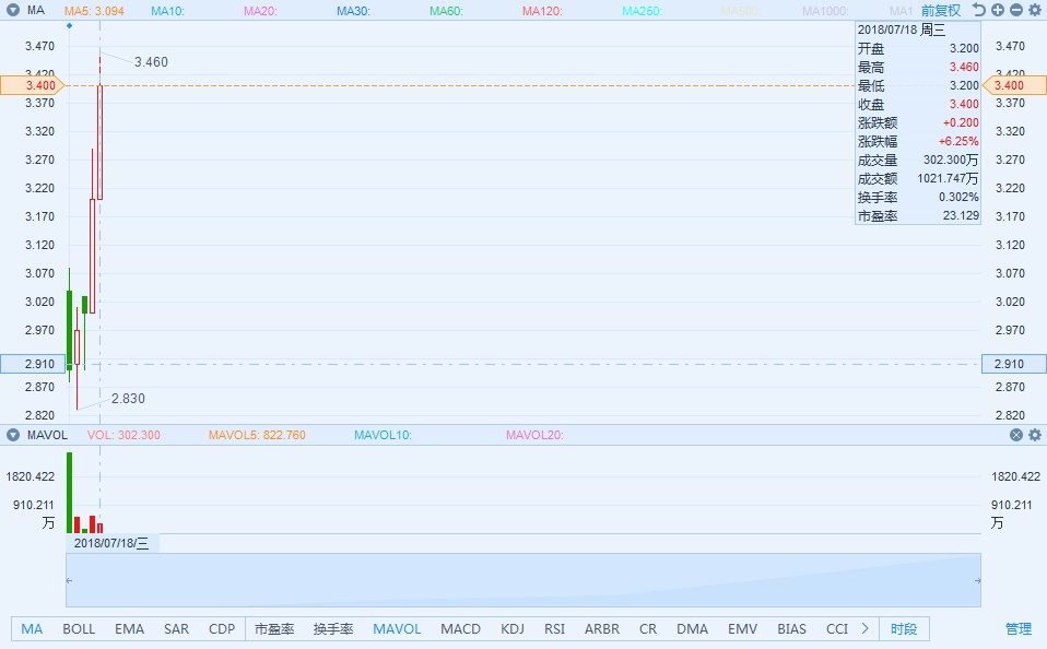 智通财经APP获悉,次新股英恒科技(01760)于2018年7月18日持续拉升,最高触及3.46港元创上市以来新高。截至11:22,成交额达1035万港元,报价3.40港元,涨幅达6.25%,较发售价2.90港元上涨逾17%。