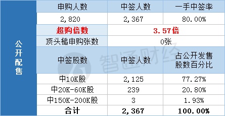 其中,公开配售申购人数2820,一手中签率80%,超购倍数3.57倍。