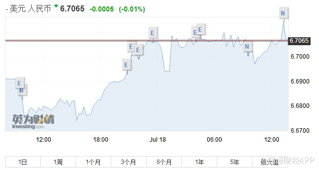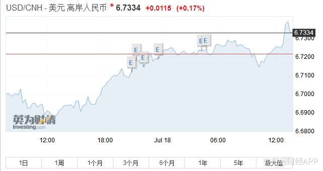 截至北京时间13:45,离岸人民币跌幅有所收窄,收复6.74关口,跌0.17%或115个点子,报6.7334;在岸人民币微升5个点子或0.01%,报6.7065。