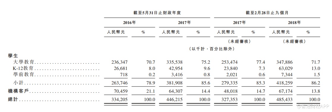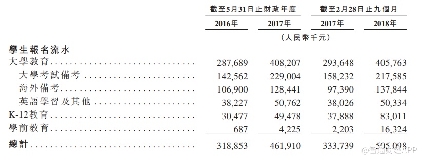 截至2016年、2017年5月31日止,总营收分别为3.34亿、4.46亿元人民币。截至2017年、2018年2月28日止,总营收分别为3.27亿、4.85亿元人民币。其中,总营收的绝大部分来自大学分部,截至2018年2月28日止,大学分部贡献营收约占总营收的70%。