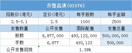智通财经APP获悉,7月18日,齐鲁高速(01576)配售结束。本次配售招股价区间为2.5-3.1港元,最终定价2.5港元,每手2500港元。