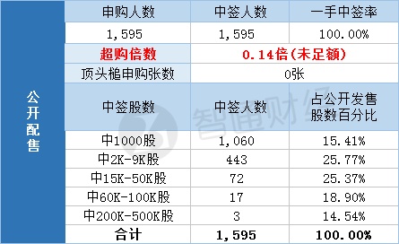 其中,公开配售申购人数1595,一手中签率100%,超购倍数0.14倍(未足额)。