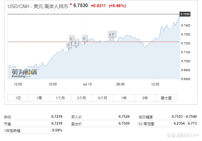 智通财经APP获悉,离岸人民币兑美元跌破6.75关口,创去年7月以来新低。截至发稿,离岸人民币兑美元报6.7530,跌311点子或0.46%。