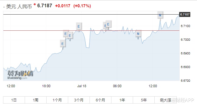 在岸人民币跌117点子报6.7187,跌幅0.17%。创2017年8月7日以来新低。