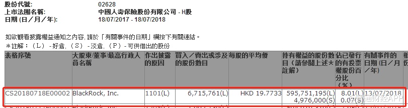 贝莱德增持中国人寿(02628)672万股 涉资1.33亿元