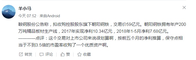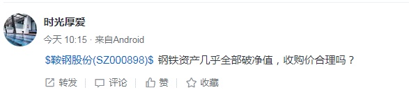 雪球网友“时光厚爱”直接质疑,鞍钢收购朝阳的价格是否合理。