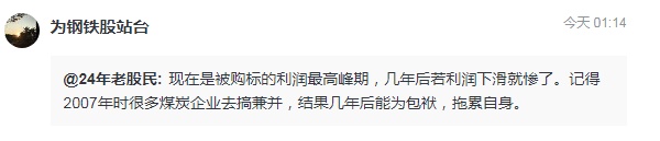 雪球网友“为钢铁站台”回忆起2007年的许多煤炭企业的兼并行为,结果在行业拐点之后,成为自身的累赘,也对鞍钢的此次收购有所顾忌。
