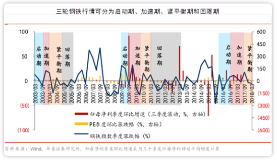 期间钢铁行情也与之相对应,钢铁股价格的波动可以分拆成估值和业绩的变动,正是各阶段归母净利季度环比增速和PE环比涨跌幅决定了钢铁行情的波动方向。