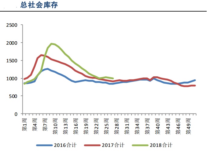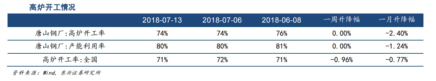 1、“量”的保持低位:继上周(7月9-13日)钢材社会库存有升转降低后,本周钢材社会库存继续下降。库存持续下降和低库存水平是维持钢价的重要保障。同时,受环保限产影响,全国和河北唐山的高炉开工率始终低于去年水平,产量受限,有利于钢材进一步去库存。