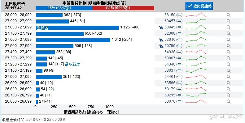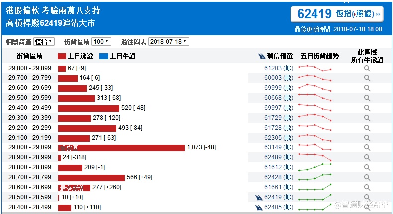 智通财经APP获悉,截至7月19日,恒指最新的牛熊街货比例为48:52。从瑞信恒指牛熊证街货分布图中得到的数据显示,熊证街货重货区在29000-29099区间,此区间最新的熊证数量为1073张,比上一交易日减少48张,最多新增在28600-28699区间,此区间最新的熊证数量为277张,比上一交易日增加260张。牛证中重货区在27800-27899区间,该区间最新牛证数量为1126张,比上一交易日减少400张;最多新增落在27200-27299这一区间,新增17张。