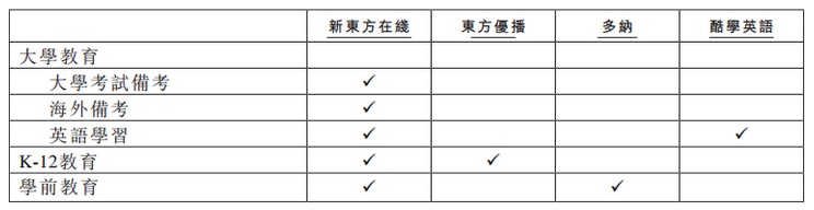 截至2018年2月28日止九个月,公司的付费学生人次总数为140万,其中大学教育付费学生人次为85.2万,占总人数的59.1%,K-12教育人次为12.9万,占比9.0%,学前教育人次为46万,占比31.9%。此外,业务还包括在线教育模组向高校、公共图书馆、电信运营商及在线视频流供应商等学校及机构客户提供教育内容套餐。课程平台包括有新东方在线、东方优播、多纳及酷学英语,下表是各个平台及其提供的课程概览。