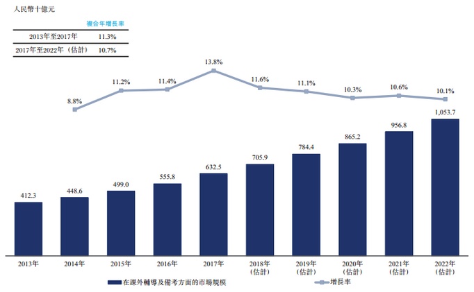 中国教育市场规模在经济及人口增长、城市化进程加快、中产阶级兴起及政府利好政策的推动下持续快速增长,从2013年的7865亿人民币增长至1.1496万亿人民币,预计2022年将达到1.7943亿人民币,2017年至2022年复合年增长率达到9.3%。伴随着中国整体教育市场增长的是课外辅导及备考市场的不断壮大,预计2022年将超过1万亿人民币,2017年至2022年的复合年增长率将为10.7%,超过教育市场整体的规模增长速度,往年及预测数据见下图。