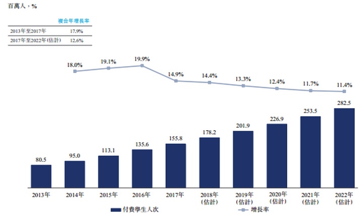从付费学生人次上看,未来仍将保持10%以上的增速,预计将从2017年的1.558亿人增加至2022年的2.852亿人,复合年增长率将为12.6%,下图就显示了历史和预测付费学生人次。