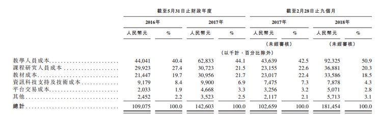 成本上看,营业成本主要来自于教学人员及课程研究人员成本,截至2018年2月28日止九个月的支出占总支出的71.2%,与去年同期的65.1%相比有所增加,说明公司在教学和课程研究上的投入在增加。