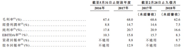 盈利能力方面,截至2016年及2017年5月31日止财政年度以及截至2017年及2018年2月28日止九个月的净利润分别是5960万、9220万、6860万及8080万人民币。截至2018年2月28日止九个月的毛利率为62.6%,净利润为16.6%,具体财务比率如下图所示,毛利率有所下降主要是K-12分部业务扩张导致成本增加造成的。