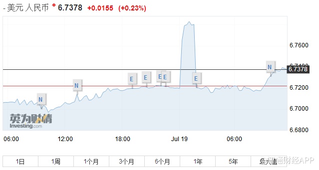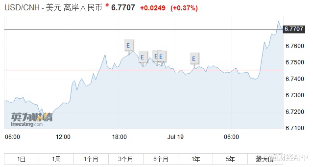 截至北京时间11:30,离岸人民币跌近250点,报6.7707,在岸人民币跌155个点子,报6.7378。