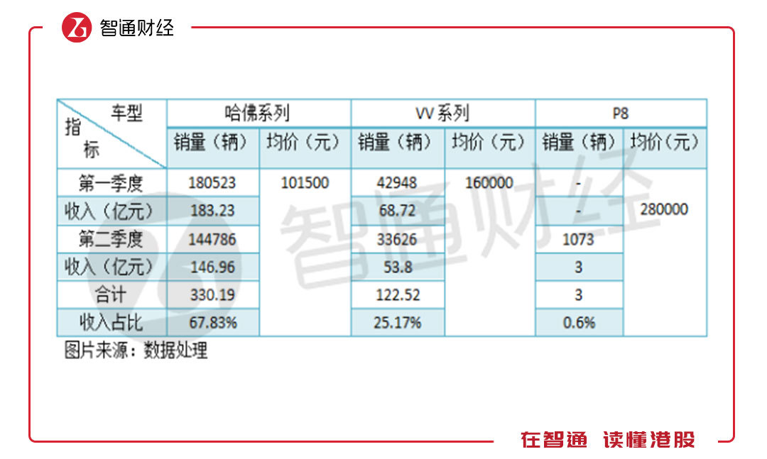 相对于第一季度,哈佛系列收入减少了36.27亿元,VV系列减少14.92亿元,皮卡风骏第二季销量比第一季增加1559辆,轿车长城C30销量增加696辆,若平均以1,0.15万元每辆计算,得到增加2.48亿元,P8增加3亿元。增减对冲下来,第二季度比第一季度减量为45.71亿元。而实际减量数字为37.8亿元,误差可能有,平均价格误差以及存在其他收入增量,比如政府补贴增加,出售资产等。