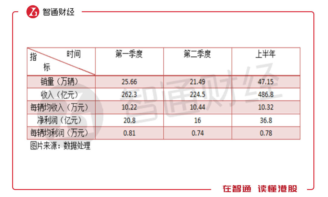 因为第二季度出现高端价位的P8,平均每辆收入10.44万元,比第一季度高0.22万元,2018年上半年平均每辆收入10.32万元,比2017年高0.92万元。从利润角度看,第二季度每辆均收入0.74万元,比第一季度低0.07万元,上半年平均0.78万元,比2017年高0.31万元。