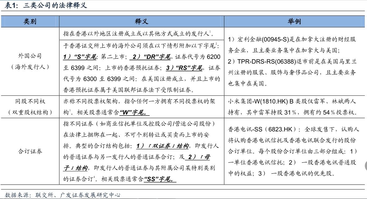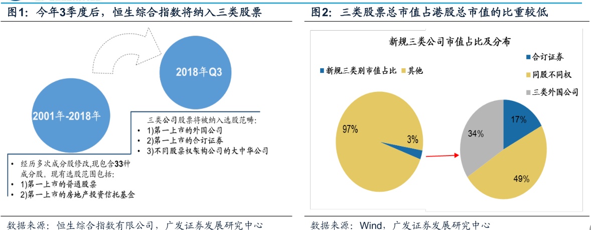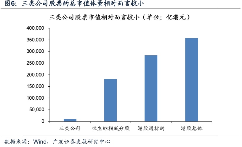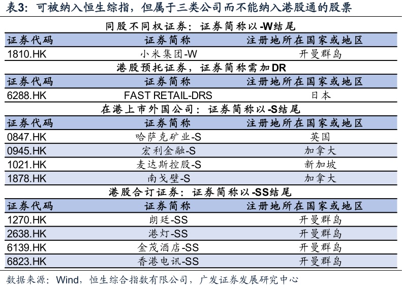 三类公司股票的界定:按照香港交易所《有关海外公司上市的联合政策声明》等相关条文规定,新纳入候选股票标识通常包含“S”字尾、“DR”字尾、“RS”字尾、“W”字尾、“SS”字尾,总市值占比约3%。