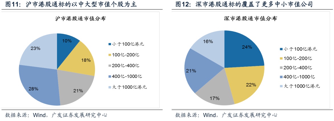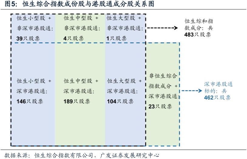 。互联互通机制发展至今,目前南下资金可投股票覆盖了恒生综合指数成份中代表性强的个股,综合考虑了市值、成交活跃度和基本面等各方面要素。目前深市港股通共462只,沪市港股通标的共317只,其中沪市港股通标的全部包括在深市港股通标的内;恒生综合指数成分股共483只,其中有439只股票同时属于以上两个范畴。具体来看,恒生综指大、中型成分股除房地产投资信托基金(REITs)外,均是港股通标的。