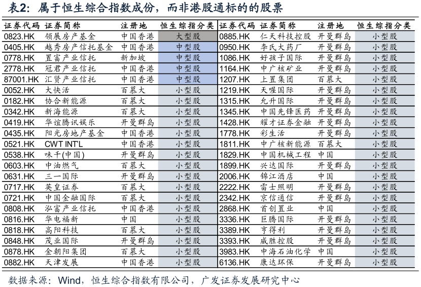 对于可纳入恒生综合指数、属于以上三类公司的潜在港股通标的暂时造成限制;特别指出的是,小米等同股不同权公司股票暂不被纳入港股通范围。近期在港上市的小米,由于其股票的同股不同权架构,暂无法纳入港股通范围,小米也成为首只除REITs外,未被纳入港股通的恒生大中型股票。除此之外,未来潜在可能被纳入恒生综指,但不属于港股通范围包括部分外国公司股票和合订证券,例如:FASTRETAIL-DRS(6288.HK)、哈萨克矿业-S(0847.HK)、朗廷-SS(1270.HK)等。但从未被纳入港股通标的市值来看,相比港股整体仍然影响较小,无需过分担忧。