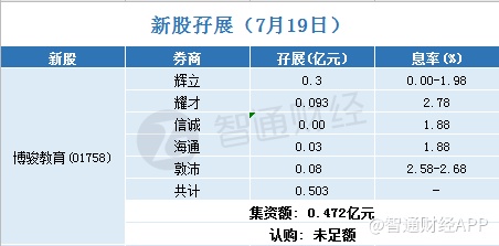 截至7月19日,正在招股的新股中,耀才、信诚、辉立、海通、敦沛5家券商为中国四川省成都市的民办教育服务集团博骏教育(01758)借出孖展金0.472亿港元,认购尚未足额。具体情况如下: