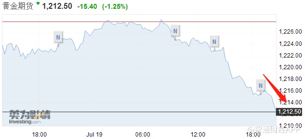 黄金期货短时间内急剧下跌,现报1212.5,跌15.4或1.25%。