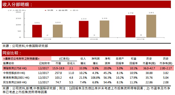 政策方面,教育部于4月底公布的《民促法实施条例(征求意见稿)》标志民办教育机构可合法牟利;而二孩政策、城镇化发展及消费升级等因素,皆利好内地民办教育市场前景。四川省入学人数预期保持稳定增长,我们预计博骏教育将受惠于大环境,录得更高入学人数及收入。集团行业地位牢固,与四川师范大学订有长期合作协议,双方在办学管理及入学录取等方面达成互助模式。我们认为,四川师范大学的品牌效应有助集团吸纳初中及高中生源,其优先录取的优势或成为吸引家长、学生入学的因素。集团亦计划在美国洛杉矶设立学校,我们认为该举可满足大量学生的海外求学诉求、并为民办教育向海外发展打下基础。集团本次赴港上市引入睿思资本、交银国际资产管理和富国基金为基石投资者。