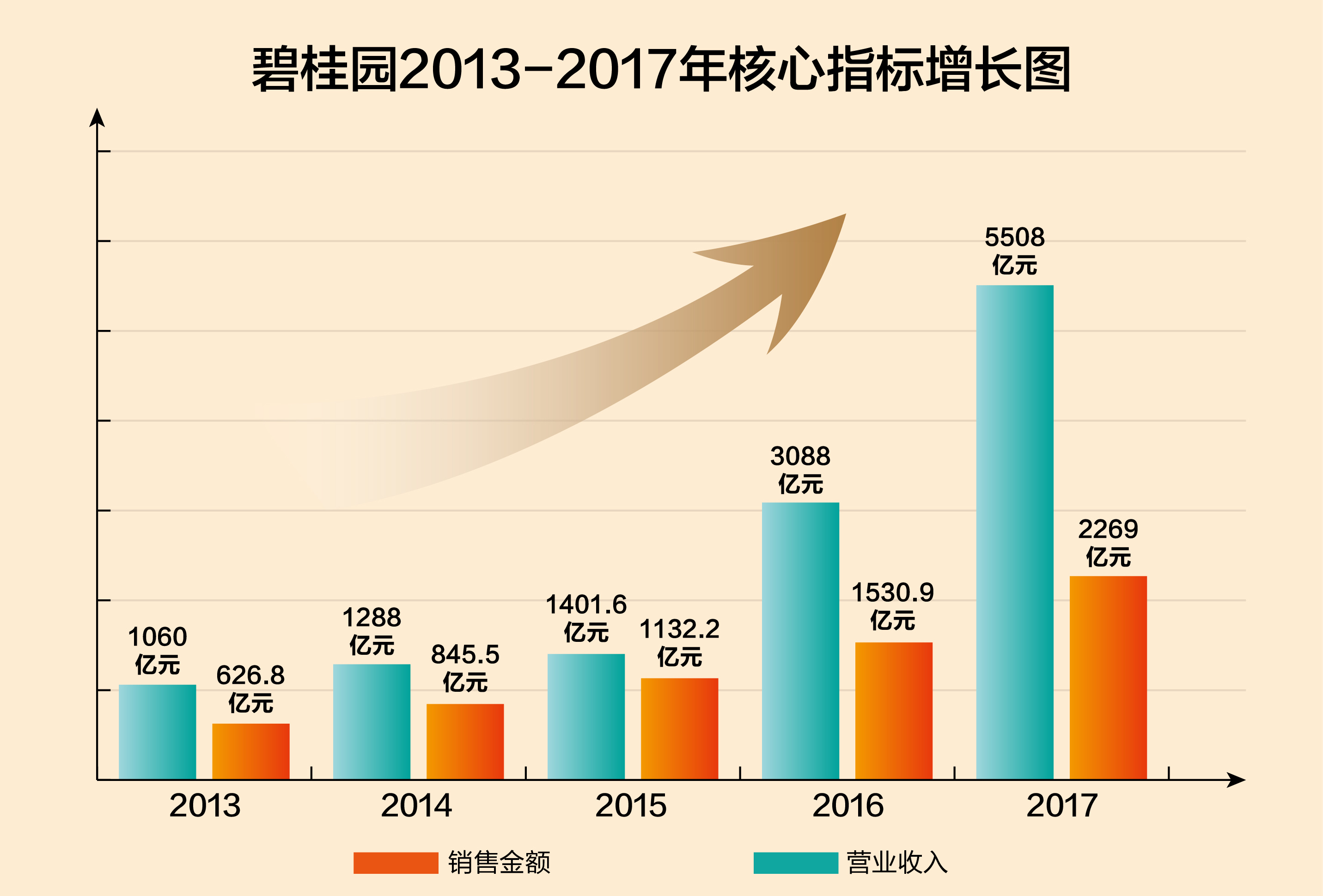 2017年,碧桂园的整体业绩表现几乎都达到了有史以来的最好水平,合同销售金额、合同销售面积、毛利、销售收入以及股东应占核心利润均较上年有较大幅度的提升,而且大幅超越行业平均增速。其中,合同销售金额达到5508亿元,较2016年增长2420亿元,同比增长78.3%,合同销售面积增长61.89%,达到6066万平方米;毛利和股东应占核心利润分别为587.9亿元和246.9亿元,增幅高达82.35%和106%。收入2269亿元,较上年跃升46%。