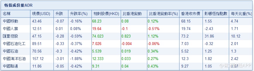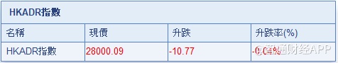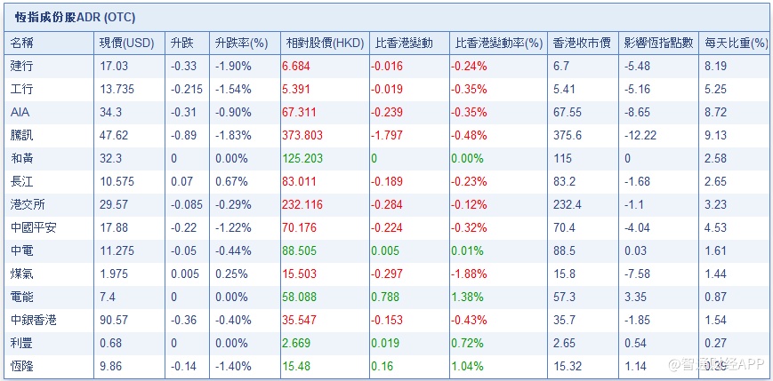 智通财经APP获悉,截至7月19日美股收盘,美股收市受压,拖累港股ADR指数全日微挫,按比例计算,收报28000.09点,跌0.77点。汇丰控股收报74.01元,较港收市升0.81元;腾讯控股收报373.8元,较港收市跌1.8元。内银股偏软,建设银行收报6.68元,较港收市跌0.02元;工商银行收报5.39元,较港收市跌0.02元。