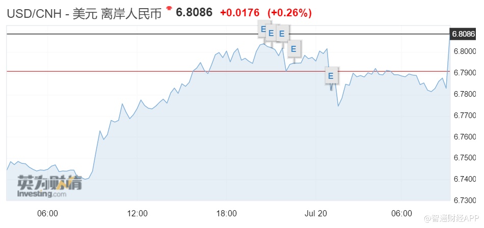 智通财经APP获悉,离岸人民币兑美元跌破6.8关口,一度跌至6.8088,日内跌近200点。此前人民币中间价下调600余点。