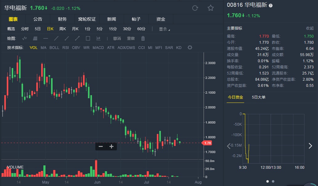截至7月20日10:05,华电福新跌1.12%,报1.76港元。