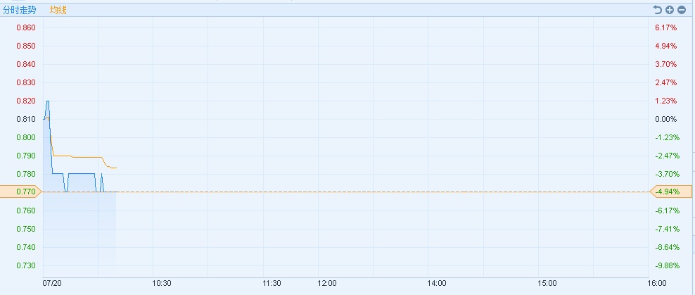 智通财经APP获悉,国美零售(00493)顺势下跌,截至10时08分,跌4.94%,报价0.77港元,成交额3867.34万。