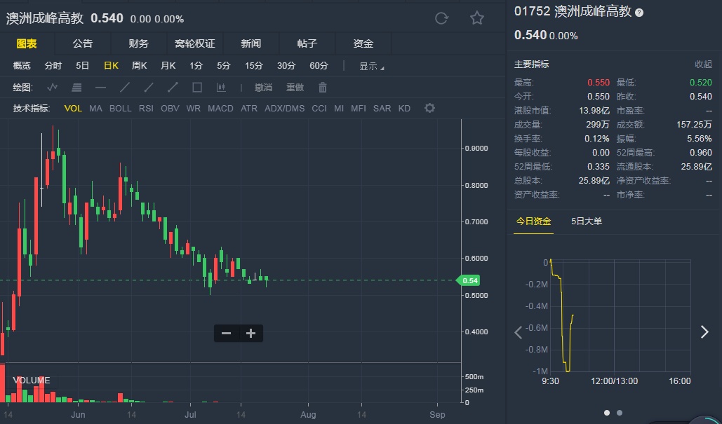 截至7月20日10:26,成峰高教报0.54港元。