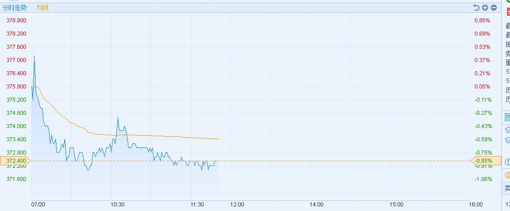 智通财经APP获悉,腾讯控股(00700)一度创年内新低至371.6港元,截至11时50分,跌0.85%,报价372.4港元,成交额29.49亿。
