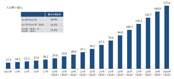 2017年中国抗病毒药物的市场收入为262亿人民币,2013至2017年的复合年增长率为10.9%,整体稳步增长。未来十年,预期创新丙型肝炎药物将在中国日益普及,中国抗病毒药物市场将在2022年增长至562亿元,到2030年增长至1770亿元。中国丙型肝炎药物市场于2028年将达到约479亿元,占整体抗病毒药物市场约33%的份额。