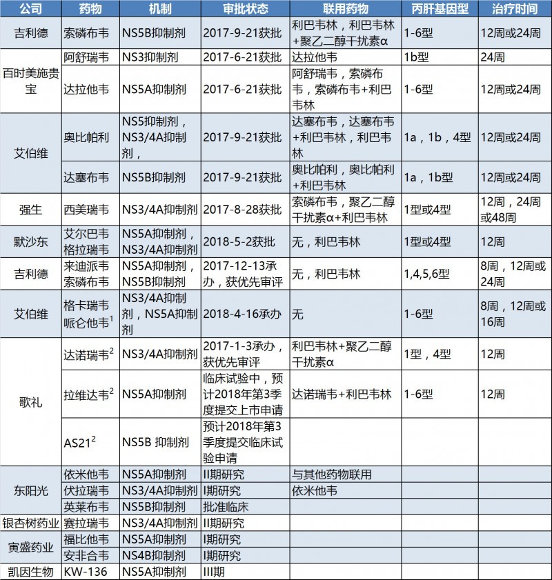 中国目前对于丙型肝炎广泛采用的是长效干扰素+利巴韦林疗法,治愈率只有40-70%,不良反应明显,周期长达1年。而国际市场上直接抗病毒药物(DAA)给丙肝治疗领域带来了革命性突破:只需12周,即可实现90%以上的治愈率。2017年,CFDA批准四项DAA疗法的新药申请,批准的治疗方案包括了DAA+PR方案以及DAA全口服方案,前者治愈率更高达到94%-97%,治疗周期12周;后者治愈率高于90%,治疗周期12至24周,适用于无法耐受干扰素的患者。由于新疗法治愈率高、治疗周期短,预计DAA药物在中国普及后将取代原有疗法成为主流。